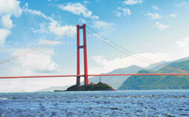 重慶萬州長江二橋 全長1148.86米,主跨580米,鋼桁梁懸索橋,2003年6月建成通車。獲2008年國家優(yōu)質(zhì) 工程銀獎(jiǎng)。