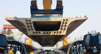 5月13日下午16時,伴隨著機(jī)器的轟鳴聲、鞭炮聲、熱烈的掌聲和歡呼聲,900T輪式提梁機(jī)將737.6噸箱梁緩緩提起,成