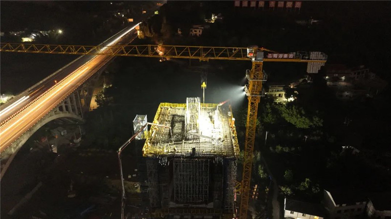 隆黃鐵路隆敘段瀘州沱江鐵路特大橋主橋?qū)侔嗡髅嫘崩瓨?酒樽造型),是國內(nèi)同類型最大跨度的鐵路單索面斜拉橋。該橋既是項(xiàng)目部的重點(diǎn)工程,也是全線的控制性工程。10#墩、11#墩0#塊件長20m,高14m,頂寬15.8m,底寬11.7m,設(shè)計(jì)混凝土方量為2400?,本次10#墩澆筑混凝土為1050?,澆筑高度為7.8-14m。此次澆筑的順利完成,標(biāo)志著沱江鐵路特大橋上部構(gòu)造施工拉開序幕,項(xiàng)目整體施工取得階段性勝利,為沱江鐵路特大橋在2023年完成建設(shè)任務(wù)奠定了堅(jiān)實(shí)的基礎(chǔ)。