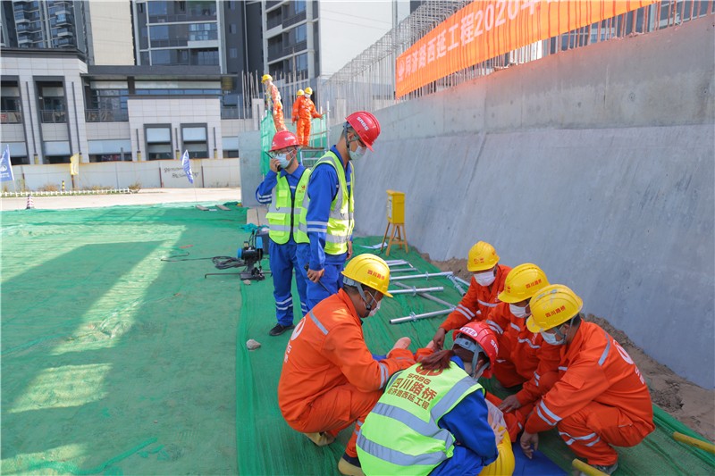 為認(rèn)真貫徹落實(shí)佛山市禪城區(qū)交通運(yùn)輸局印發(fā)《佛山市禪城區(qū)交通運(yùn)輸局(區(qū)軌道交通局)突發(fā)事件應(yīng)急管理工作規(guī)范》和《佛山市禪城區(qū)交通運(yùn)輸行業(yè)突發(fā)事件總體應(yīng)急預(yù)案》的文件精神,不斷提高項(xiàng)目應(yīng)對(duì)突發(fā)事件的應(yīng)急保障能力。2020年11月24日下午15:30,同濟(jì)路西延工程組織開(kāi)展了2020年綜合應(yīng)急救援演練,禪城區(qū)交通運(yùn)輸局質(zhì)管科科長(zhǎng)葉峰、安全科副科長(zhǎng)邱建萍、交建科副科長(zhǎng)尚建國(guó)、廣東佛盈匯建工程管理有限公司總經(jīng)理胡英豪、副總經(jīng)理陳金水、胡永強(qiáng)、總工程師姜同輝、佛山市第一人民醫(yī)院禪城醫(yī)院及建設(shè)單位管轄的其他在建公路工程、市政工程、水利工程、房建工程的監(jiān)理單位總監(jiān)及施工單位項(xiàng)目經(jīng)理等七十余人到場(chǎng)觀(guān)摩指導(dǎo)。