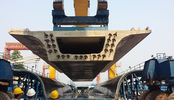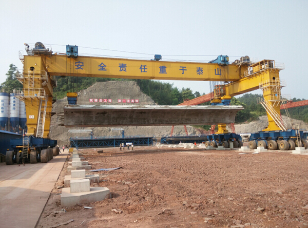 900T輪式提梁機(jī)是吊運(yùn)箱梁的主要起重設(shè)備,自重550噸,額定運(yùn)載能力900噸,凈跨寬度38米,起吊高度12.5米,主要用于24米至32米箱梁的脫模移梁施工。該提梁機(jī)的主體結(jié)構(gòu)由行走系統(tǒng)、起升系統(tǒng)、動(dòng)力系統(tǒng)、液壓系統(tǒng)、電控系統(tǒng)、制動(dòng)系統(tǒng)、操作系統(tǒng)等主要結(jié)構(gòu)組成。其外部主體結(jié)構(gòu)還包括端主梁與橫梁,主梁另有單主梁與雙梁形式;4條支腿、64個(gè)車輪。該機(jī)主結(jié)構(gòu)為門架結(jié)構(gòu),采用“人”字型支腿,可進(jìn)行大幅度起升、高度調(diào)整和90°轉(zhuǎn)向跨區(qū)作業(yè),結(jié)構(gòu)先進(jìn)、合理,操作可靠、安全,作業(yè)靈活。