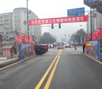 2014年12月29日上午10時(shí)30分,舉行了G318線渠縣渠江大橋恢復(fù)通車(chē)的儀式。渠縣縣委書(shū)記王善平、縣長(zhǎng)茍小莉、 橋梁公司董事長(zhǎng)蔡樂(lè)軍出席??h委、縣政府相關(guān)單位負(fù)責(zé)人,特種工程分公司總經(jīng)理吳春其、黨支部書(shū)記魏文生陪同參加。