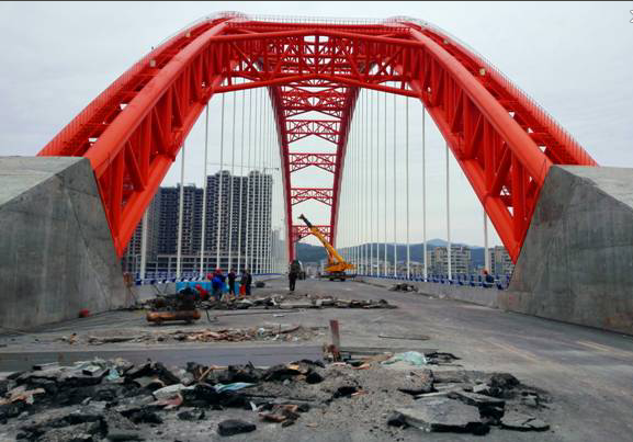 蒼溪縣嘉陵江三橋作為我公司第一個BT項目工程,為橋梁公司創(chuàng)新發(fā)展帶來新的機遇及理念。下承式鋼管混凝土系桿拱橋,對支承系統(tǒng)、主拱肋拱軸線控制系統(tǒng)、鋼管混凝土配制、主拱肋鋼管的拼裝等施工工藝都有特殊的要求,因此技術(shù)復(fù)雜,施工難度大。從2013年1月開工至今天,23個月的日日夜夜跨越兩個漫長的酷暑,回想在施工過程中遇到的各種困難,全體員工無不感慨萬千。蒼溪縣嘉陵江三橋取得今天的勝利是項目部全體員工共同努力、迎難而上的結(jié)果,更是“川橋”兒女齊心協(xié)力、堅強毅力的見證,相信在我們辛勤的付出之后蒼溪縣嘉陵江三橋最終定會收獲成功的果實,為蒼溪人民交一份滿意的答卷。
