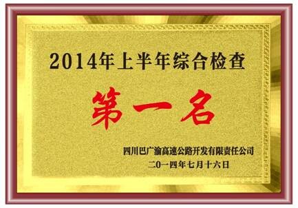 7月17日,四川巴廣渝高速公路開發(fā)有限責(zé)任公司在廣安召開2014年第二季度暨半年綜合大檢查總結(jié)會,在會上巴南廣高速公路TJ1合同段第九分部同時摘得第二季度和半年綜合大檢查雙項第一名貴冠,這是繼去年榮獲業(yè)主半年綜合評比第三名之后,為公司在巴南廣高速公路建設(shè)中贏取的又一重要殊榮。