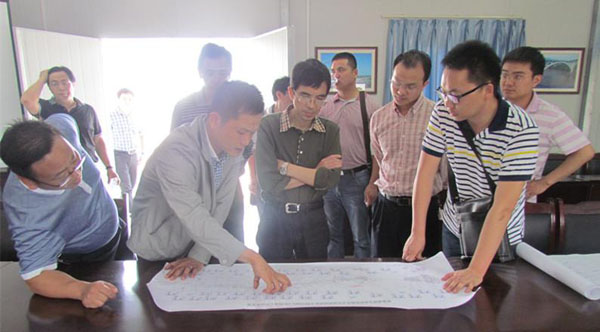 謝副市長(前中)聽取在四川路橋成貴鐵路項目經(jīng)理部黨工委書記夏勇(前左二)匯報我部征拆推進(jìn)情況。