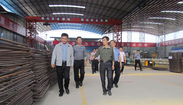 謝副市長(前右一)在四川路橋成貴鐵路項目經(jīng)理部黨支部書記夏勇(前左一)陪同下參觀一分部標(biāo)準(zhǔn)化鋼筋加工場。